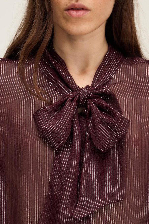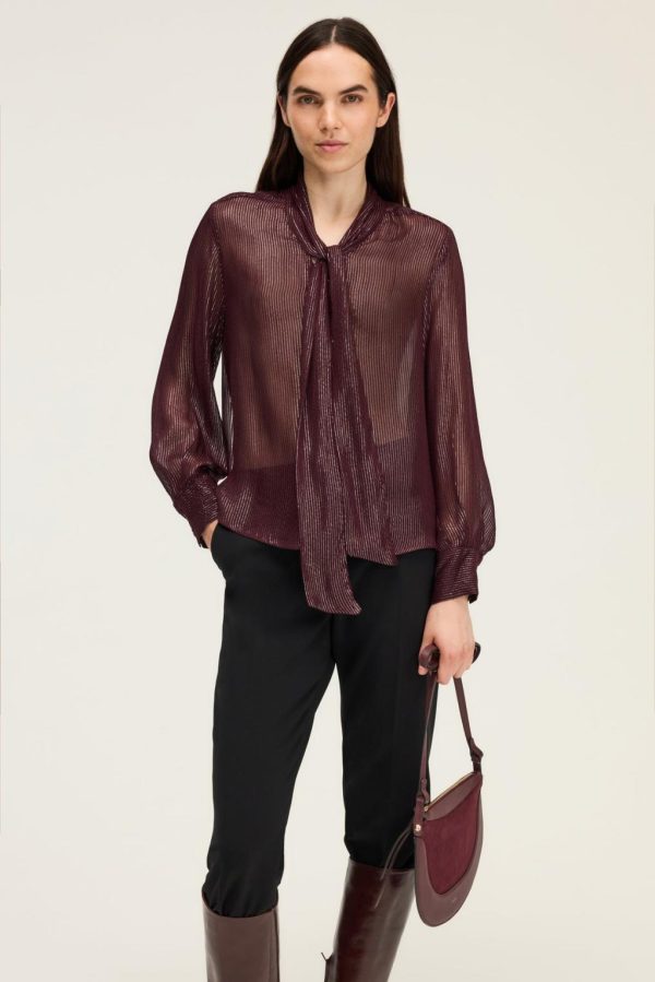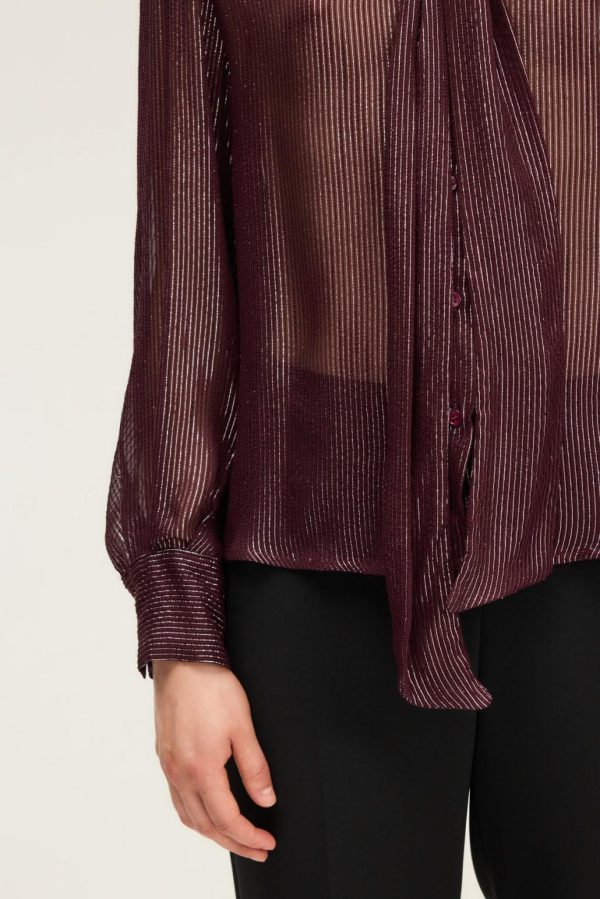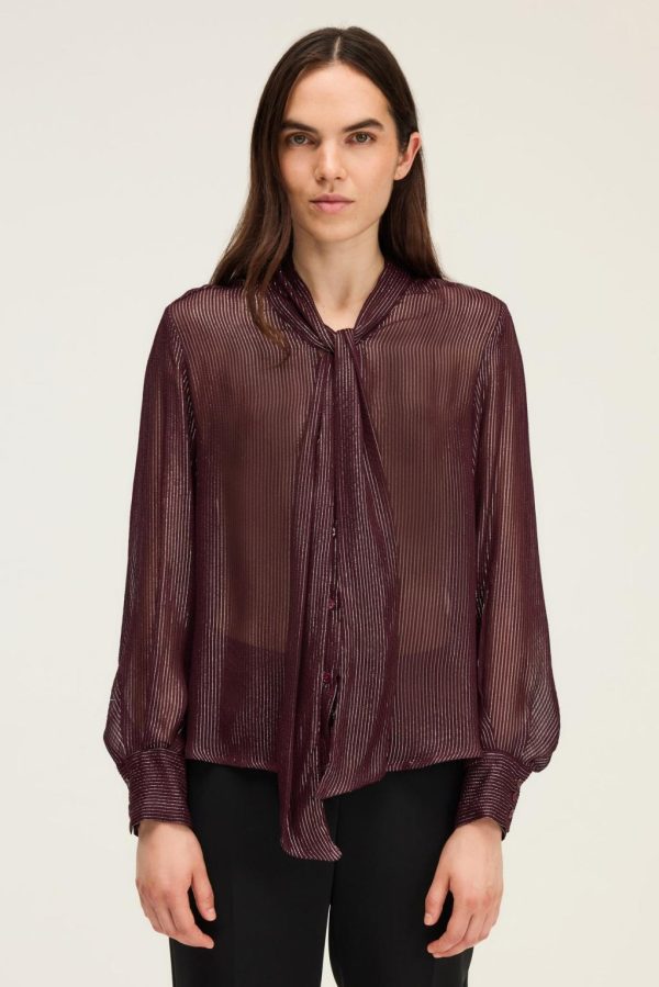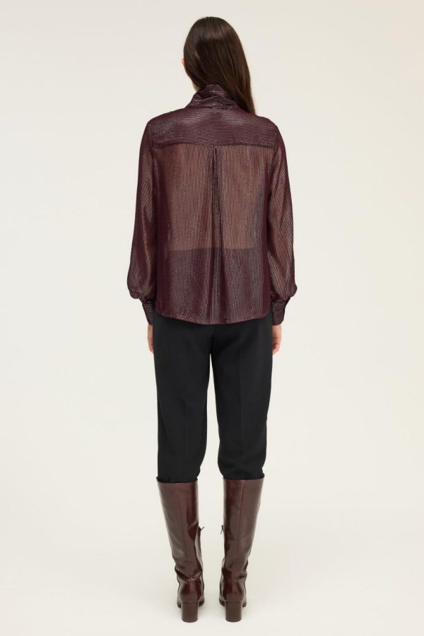 Esprit festif pour cette chemise en mousseline bordeaux et ornée de rayures en lurex argenté. Son col lavallière lui offre un petit côté seventies.