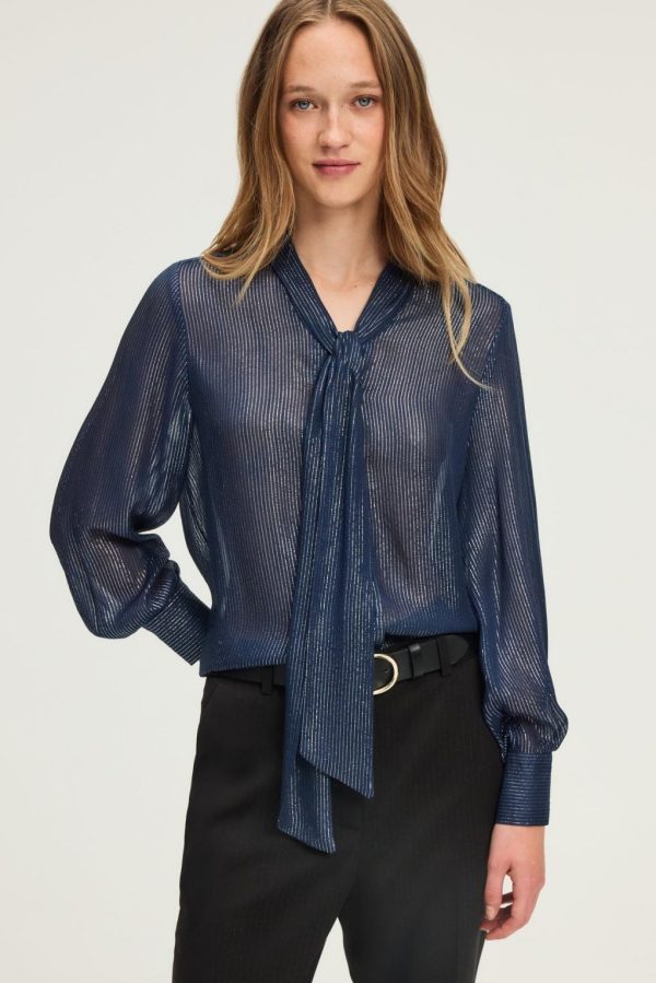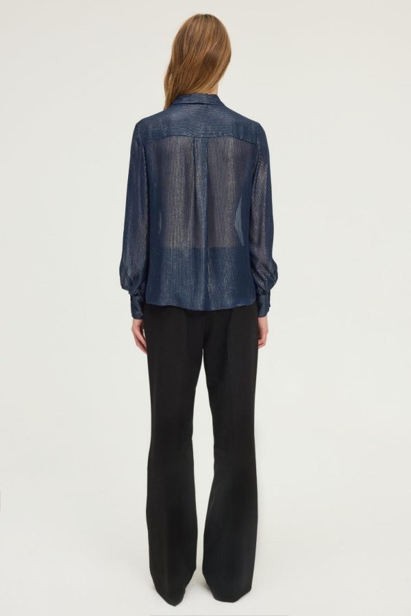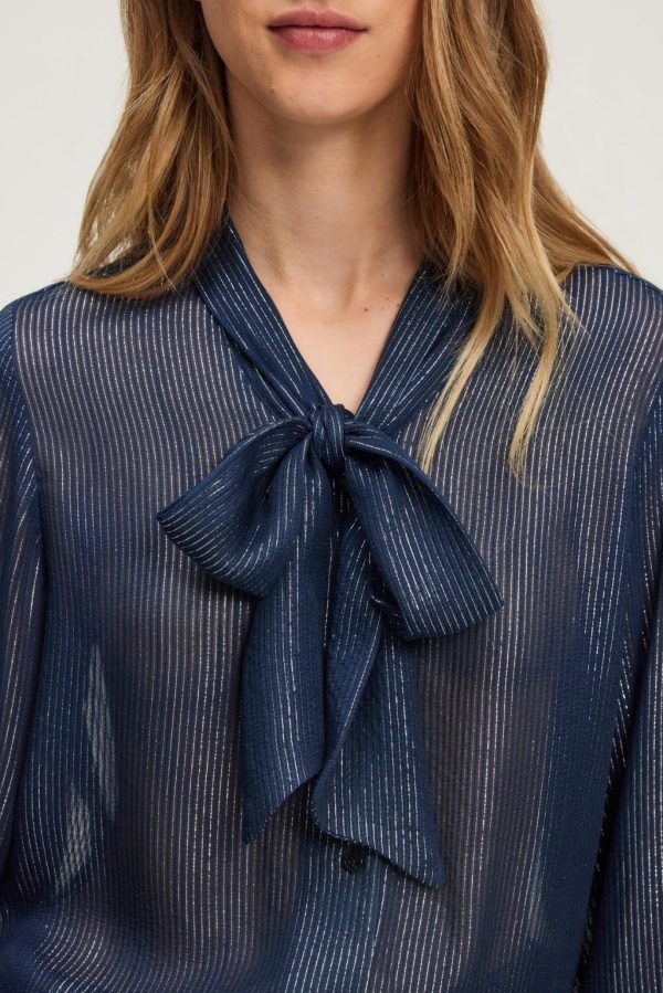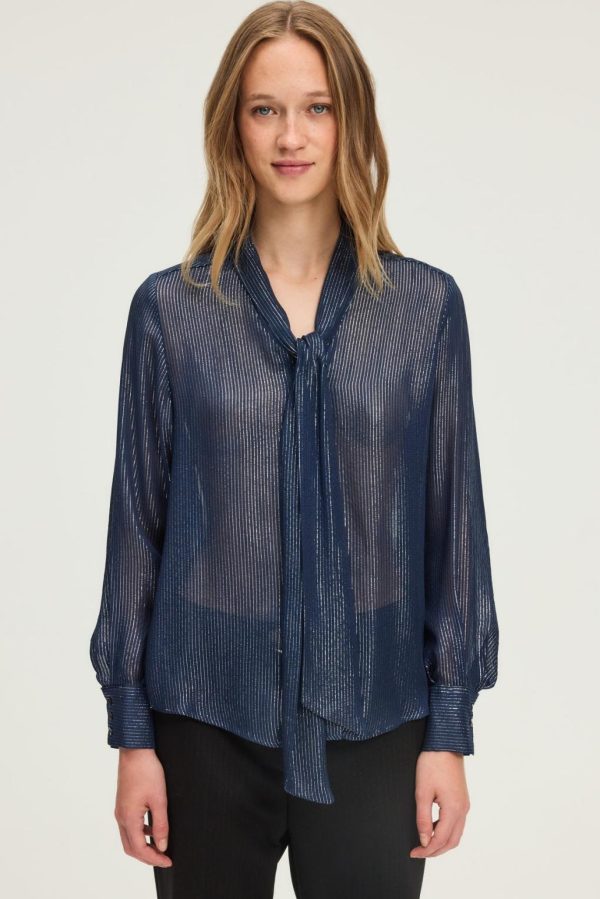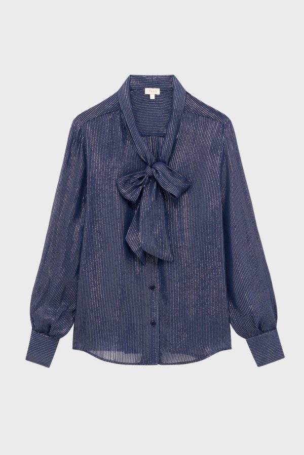 Esprit festif pour cette chemise en mousseline bleu foncée ornée de rayures en lurex argenté. Son col lavallière lui offre un petit côté seventies.