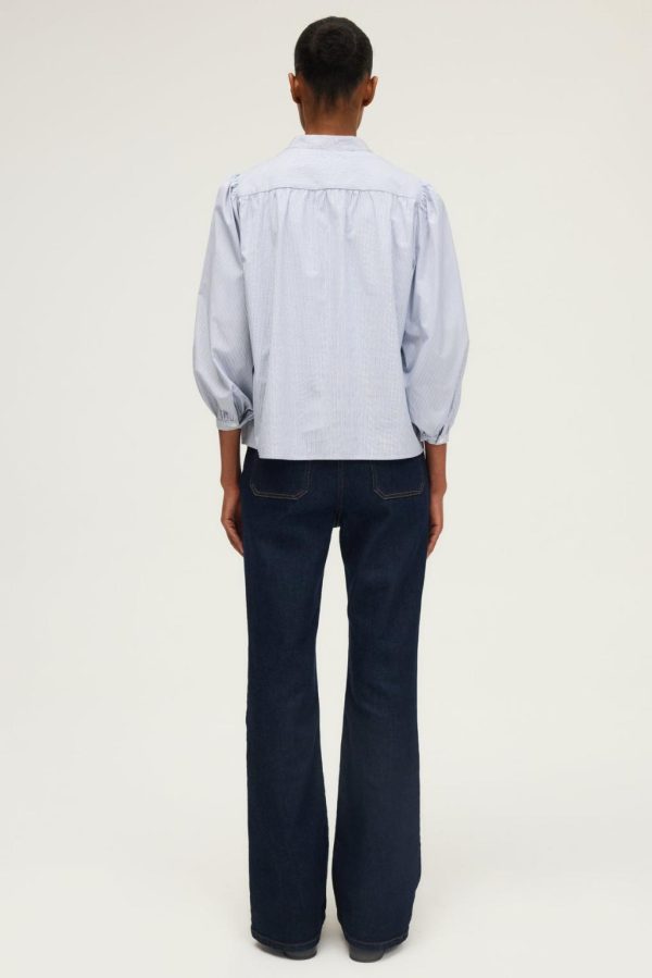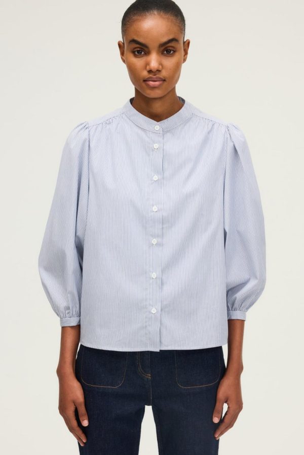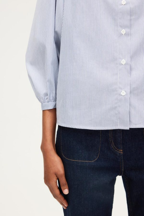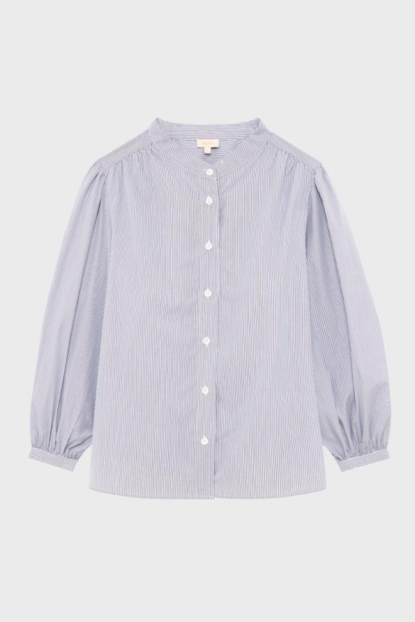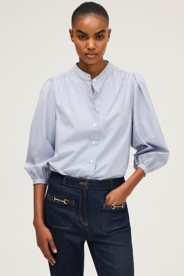 Esprit masculin féminin pour cette chemise à rayures bleues sur fond blanc et ornée d’un col officiel. 100% coton.