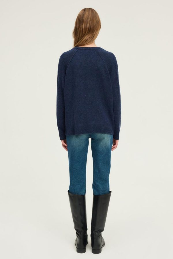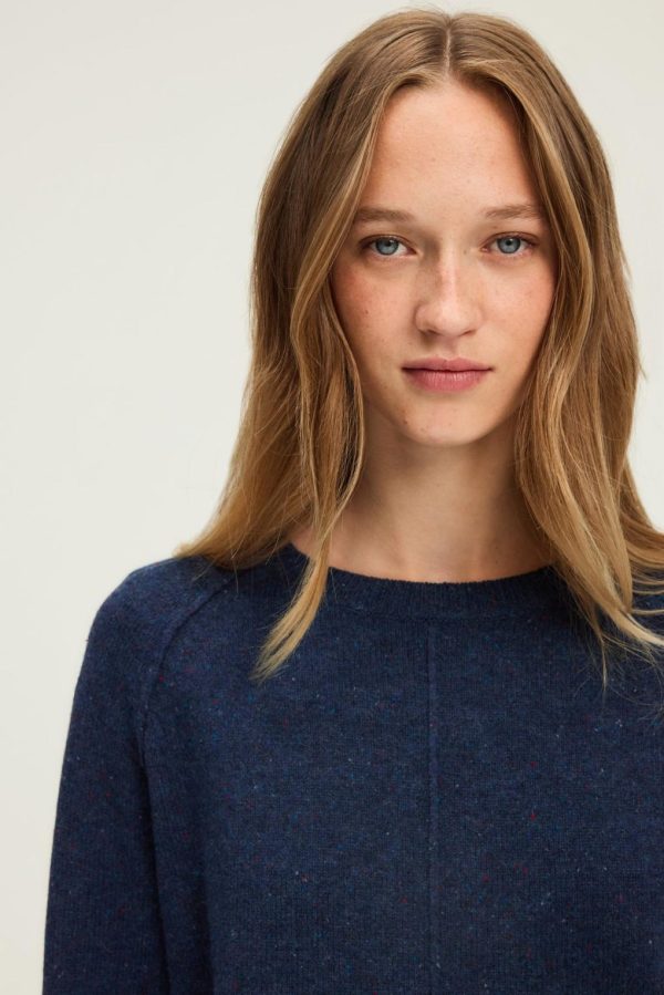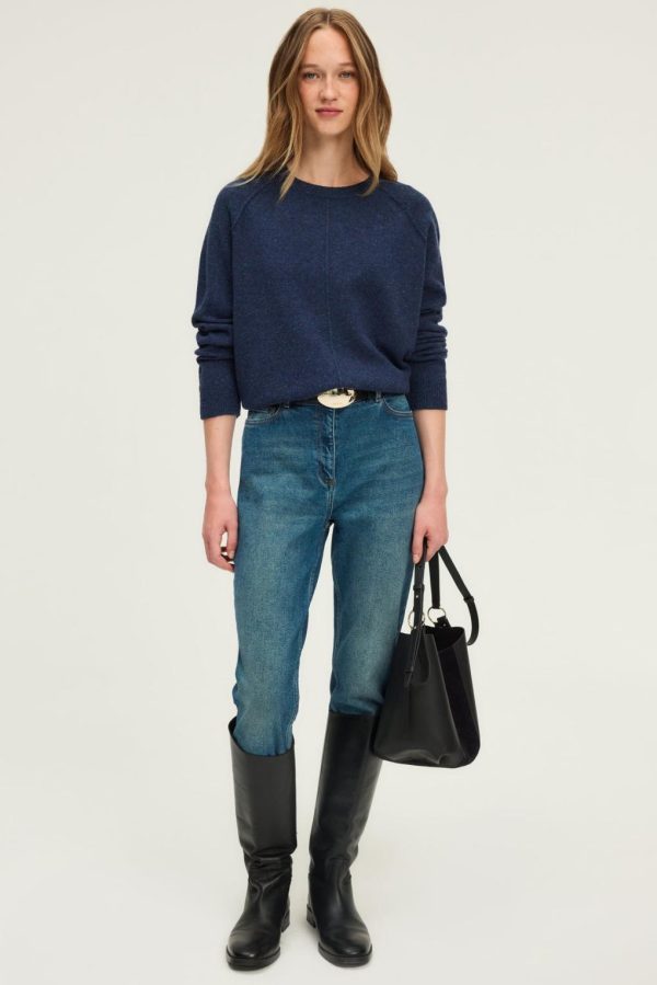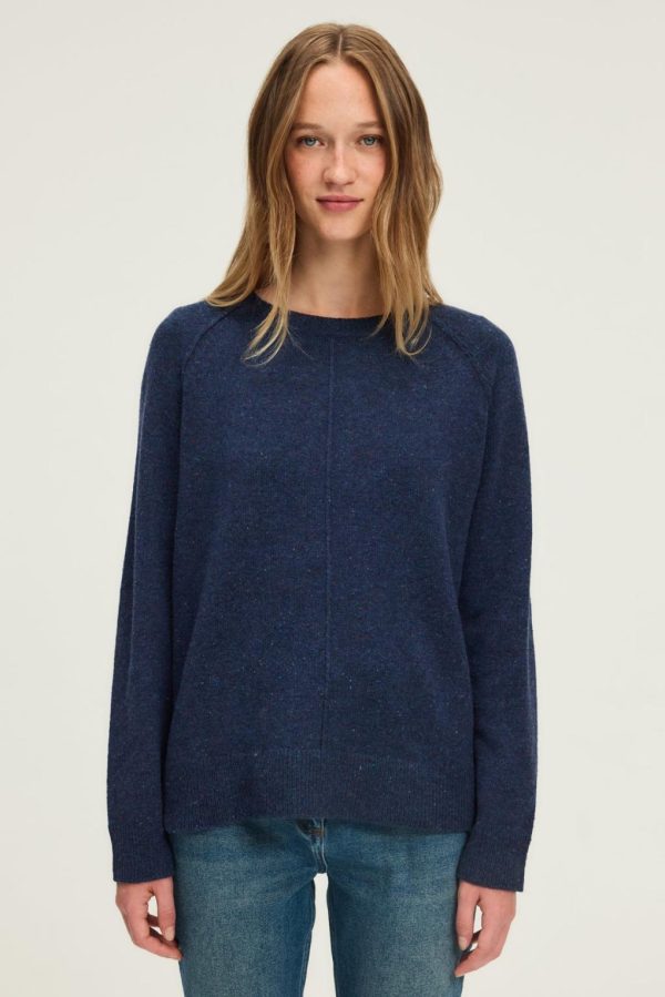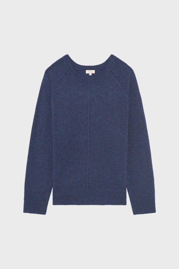 Pull à col rond en 100% laine bleue foncée à l’aspect légèrement chiné pour un porter décontracté. Il se démarque par ses coutures en relief qui apporte style et modernité.